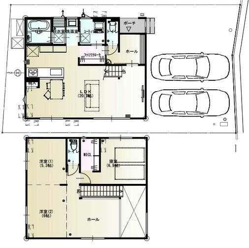 | 間取: | 1F)LDK20.7 FCL ユーティリティ 洗面 浴室 トイレ 2F)洋6.9+WIC 洋6 洋5.3 トイレ |