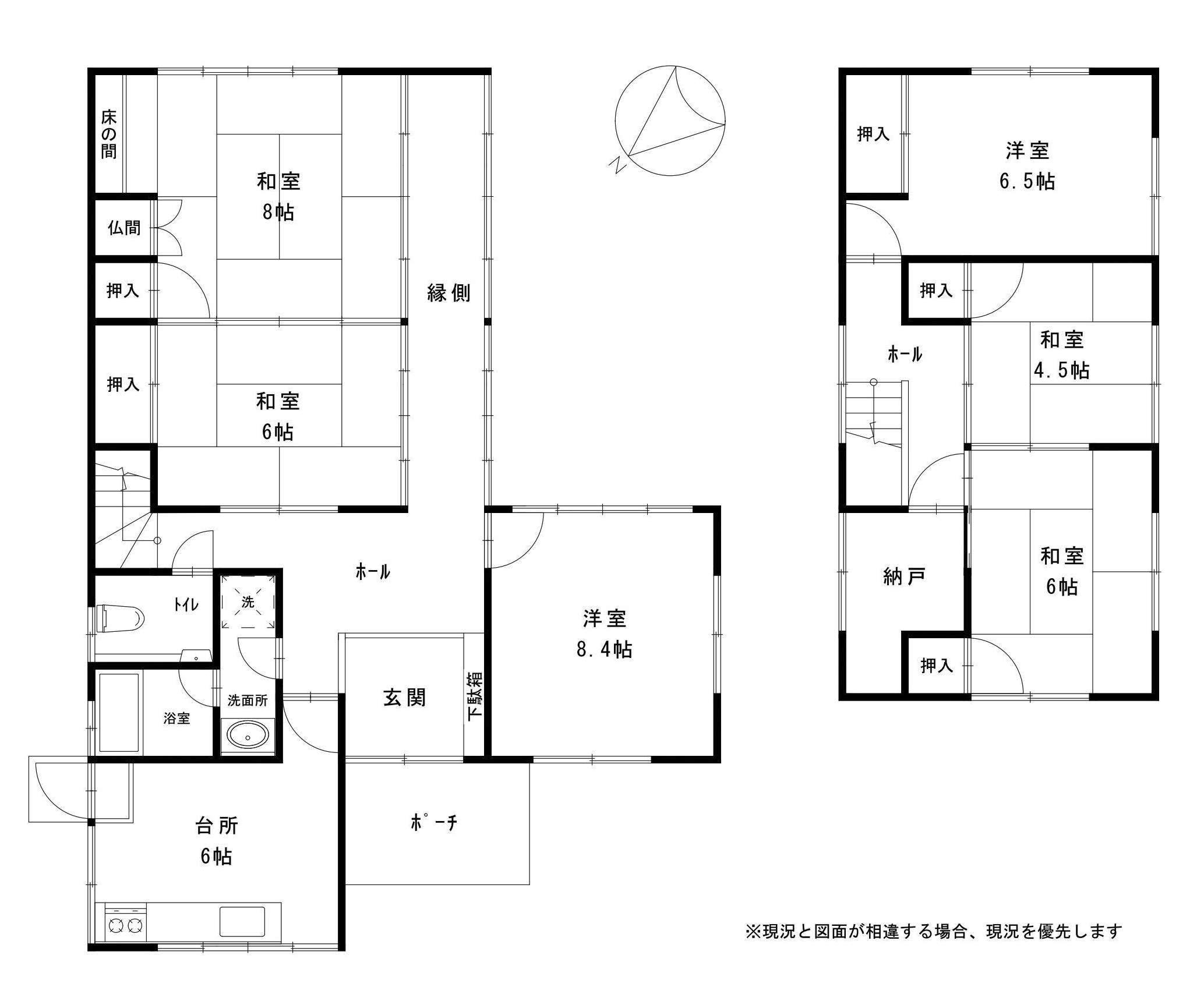| 間取: | 1F)K6 洋8.4 和8 和6 洗面 浴室 トイレ 2F)洋6.5 和6 和4.5 納戸 |