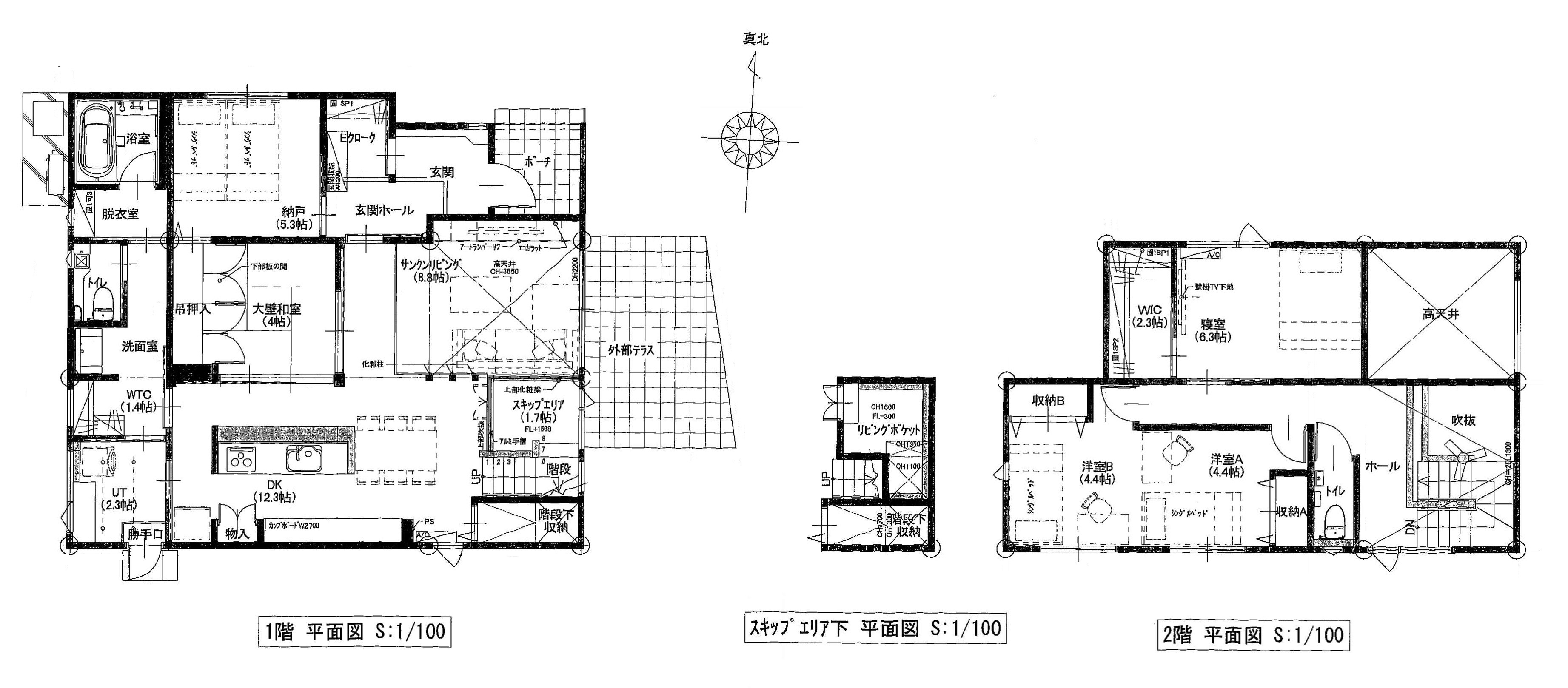 | 間取: | 1F)LDK21.1 和4 納戸5.3 UT1.4 洗面 脱衣室 浴室 トイレ / スキップエリア1.7 / 2F)洋6.3+WIC2.3 洋8.8(2分割可) トイレ | ||