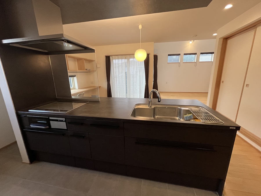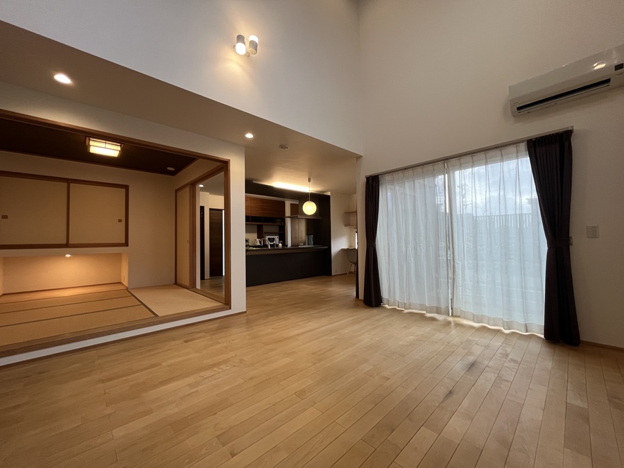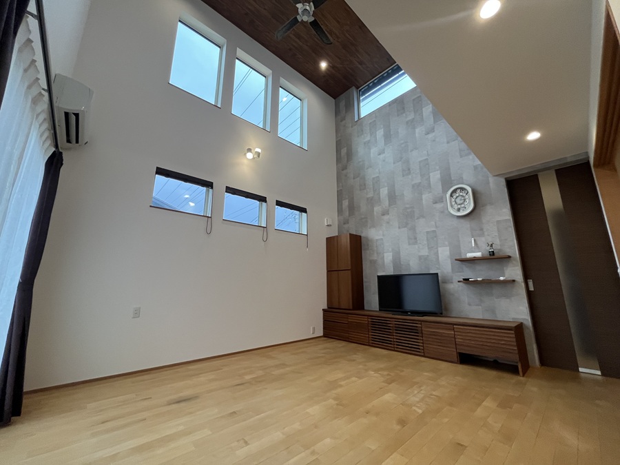 一級建築士事務所監修の高気密高耐震4SLDK! LDK22.9帖には吹抜けがあって更に広がりと開放感♪ キッチン横のサンルームで家事動線が短く◎トリプルサッシ採用で快適な住空間!