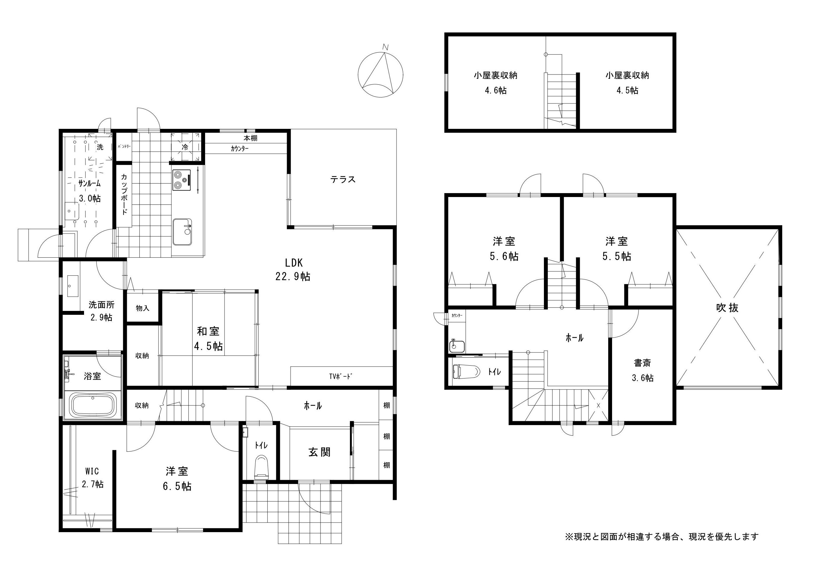 | 間取: | 1F)LDK22.9 洋6.5+WIC 和4.5 洗面 浴室 トイレ サンルーム / 2F)洋5.6 洋5.6 書斎3.6 洗面 トイレ 小屋裏収納 | ||