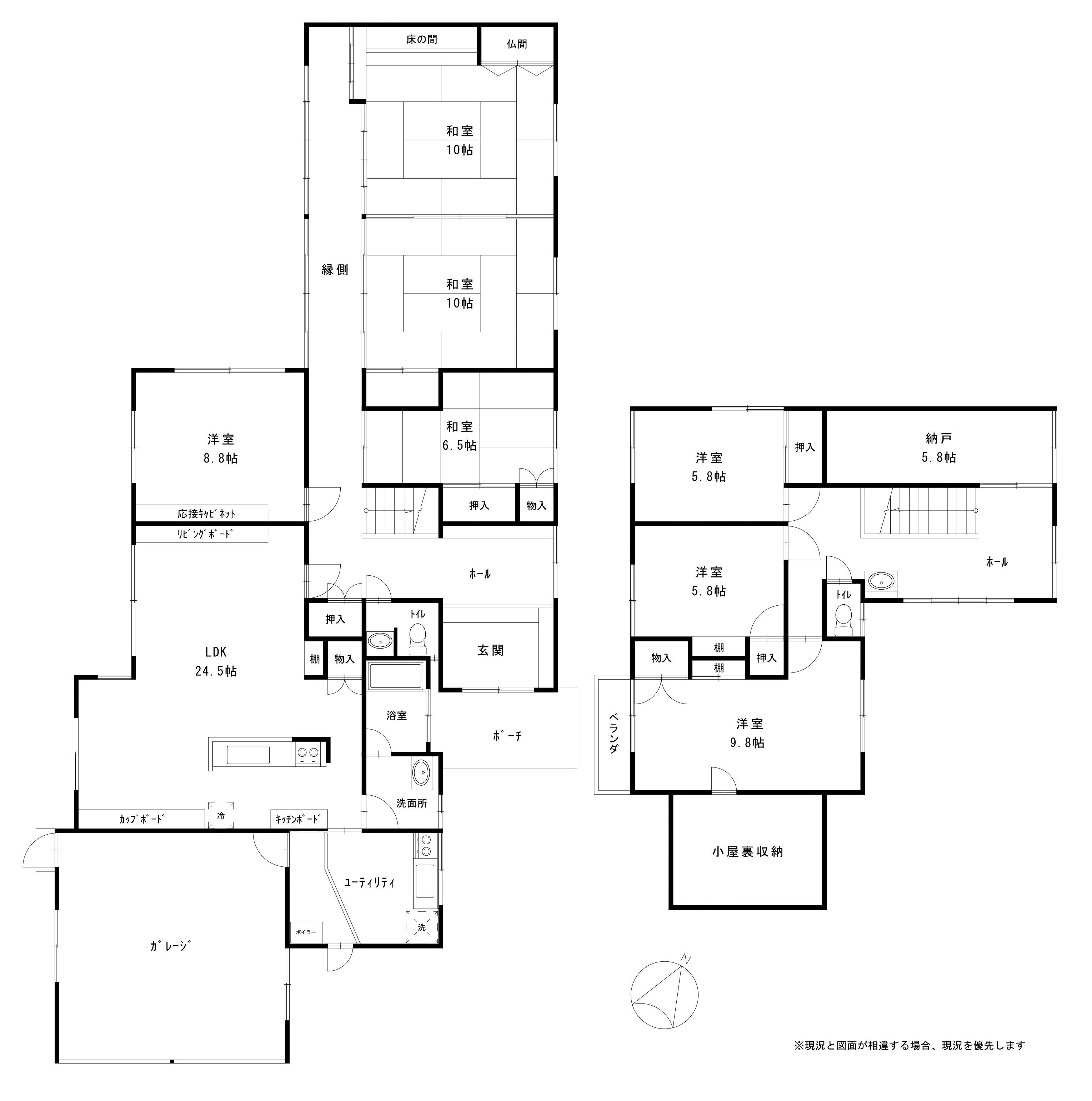 | 間取: | 1F)LDK24.5 洋8.8 和10 和10 和6.5 ユーティリティ 洗面 浴室 トイレ ガレージ / 2F)洋9.8 洋5.8 洋5.8 納戸5.8 洗 トイレ 小屋裏収納 | ||
